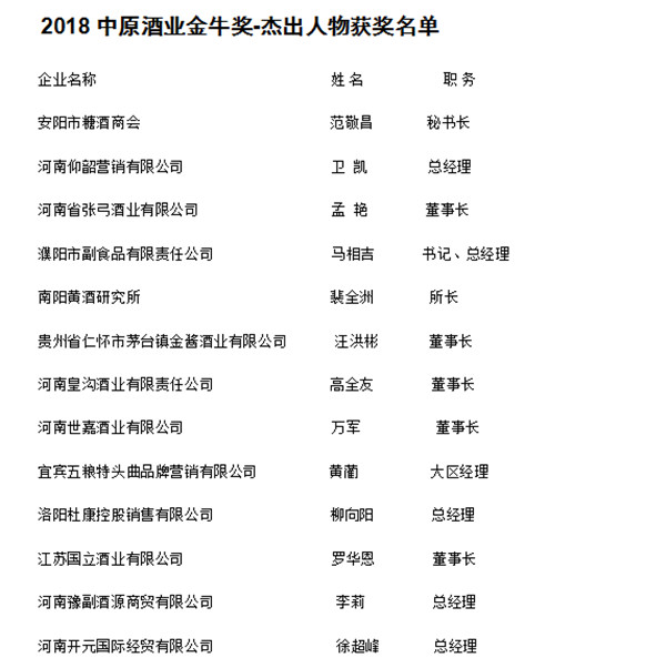 金牛奖-卓越人物、杰出人物、杰出品牌具体获奖名单,其他奖项获奖名单均将在颁奖盛典现场揭晓。8月24日16:00~20:00,郑州国际会展中心轩辕堂,2018中原酒业金牛奖颁奖盛典,敬请期待!