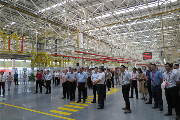 图为江西省副省长吴晓军<前排站黄线位置中>和部分参加“全省工业强省推进大会”的代表参观国机智骏制造车间情景