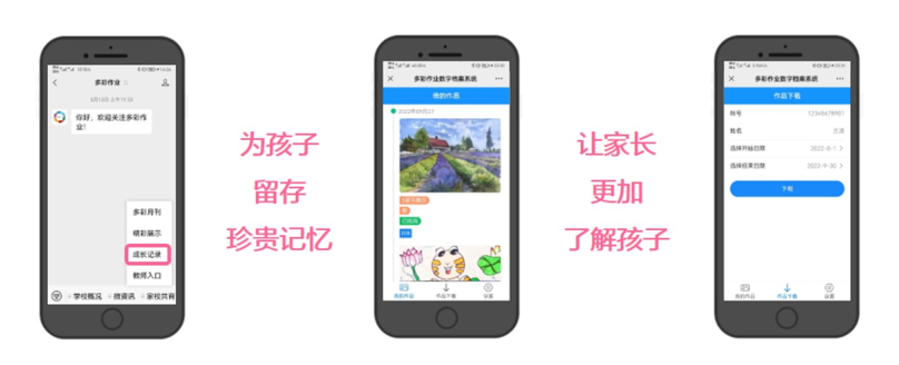 在“多彩作业”美育方案中,家长可以通过学校公众号登录“多彩作业”小程序,按时间顺序查看孩子的历史画作与成长记录,还可以按日期范围下载孩子的美术作品,并创建朋友圈画展,通过朋友圈的“一键分享”来表达对孩子成长的喜悦,同时帮助学校传播素质办学的好口碑。“多彩作业”可以让孩子成长的珍贵记忆一直保存下去,让家长更为了解孩子的成长、更为了解学校的美育进程和体系,实现家校互通。