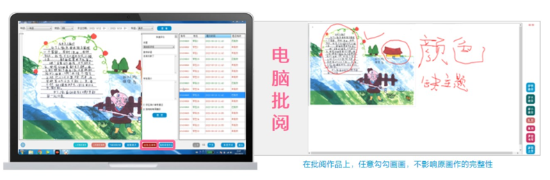 小孟老师说,相比于传统的纸笔批阅,他更喜欢一键云上批阅:手机端批阅可以对采集好的画作进行快速语音点评;同时,电脑端批阅可以生成批阅微课视频,这样既可以在画中标记出批阅思路,又不会对原画造成破坏,学生可自行查看老师批改指导建议,达到“面对面”授课的效果,提升教学质量。