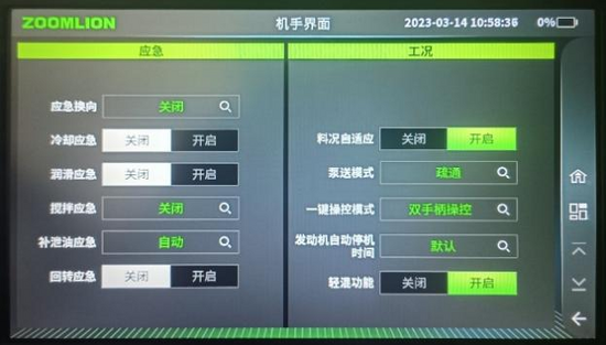①驾驶室显示屏“机手界面”开启轻混功能,并设置发动机自动停机时间(出厂默认设置为2分钟(时间可调))